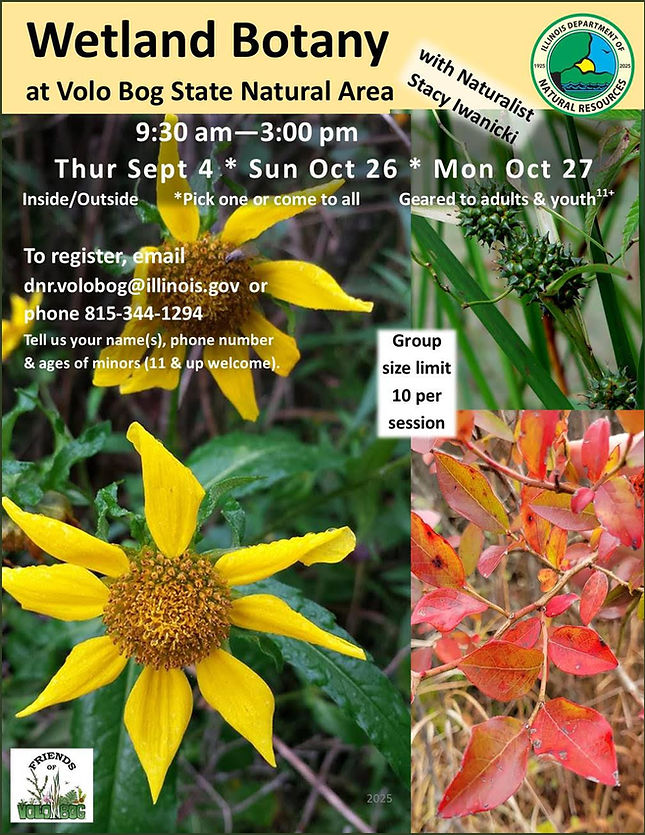 All ages are welcome. Registration is requested at 815-344-1294 or dnr.volobog@illinois.gov Group size is limited - Walk-ins welcome if space allows but walk may be cancelled if minimum registration is not met 24 hours prior. Please dress for the weather with comfortable hiking shoes and a broad-brimmed hat. Bring (but do not pre-apply) insect repellent.